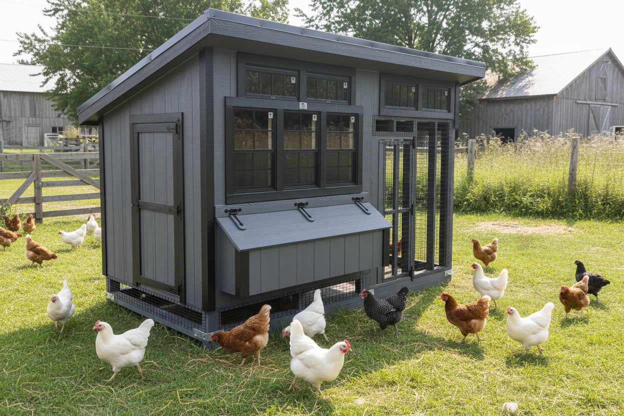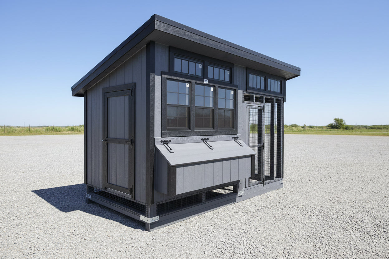 ~ 06X12 Dakota Storage Skillion Combination Coop Wood Panel ~ Building Color - Peppercorn (SW 7674) Super Paint ~ Trim Color - *FASCIA, CORNER, WINDOW & DOOR TRIM* - Tricorn Black (SW6258) Super Paint ~ Steel Roof - Black LC