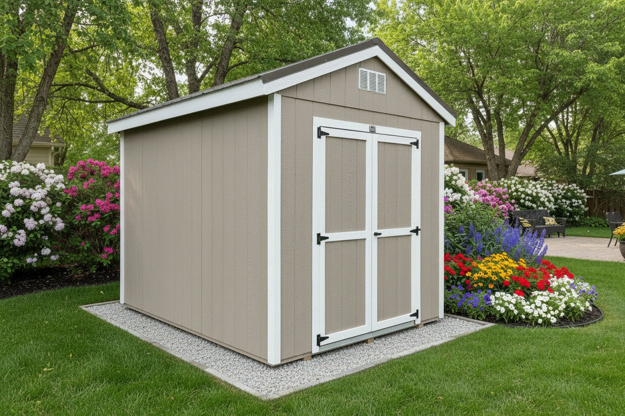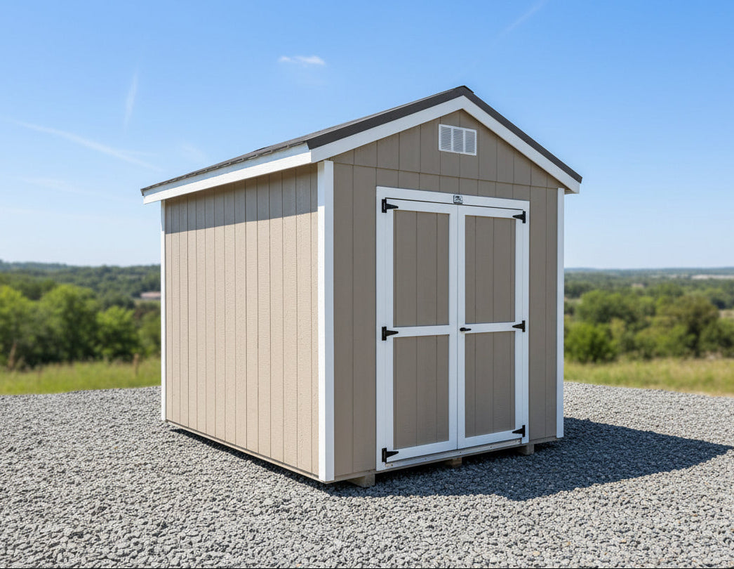 ~ 08X10 Utility Ranch Wood Panel Shed ~ Building Color - Taupe Tone (SW 7633) Super Paint ~ Trim Color - *FASCIA, CORNER, & DOOR TRIM* - Super White (SW 6995) ~ Steel Roof - Burnished Slate LC
