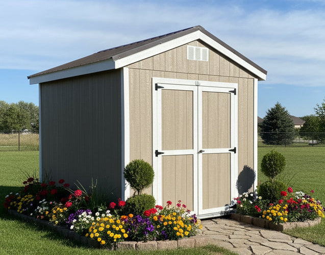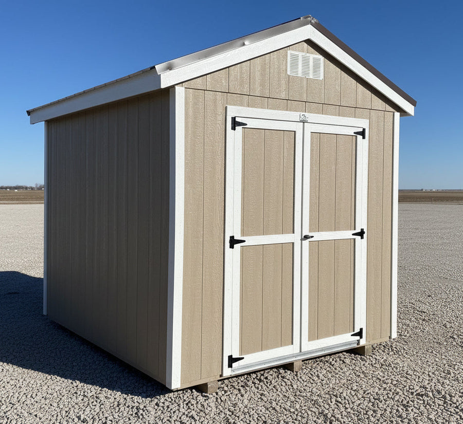 ~ 08X10 Utility Ranch Wood Panel Shed ~ Building Color - Taupe Tone (SW 7633) Super Paint ~ Trim Color - *FASCIA, CORNER, & DOOR TRIM* - Super White (SW 6995) ~ Steel Roof - Burnished Slate LC