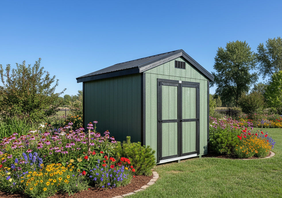 ~ 08X10 Utility Ranch Wood Panel Shed ~ Building Color - Rosemary (SW6187) Super Paint ~ Trim Color - *FASCIA, CORNER, & DOOR TRIM* - Tricorn Black (SW6258) Super Paint ~ Steel Roof - Black LC