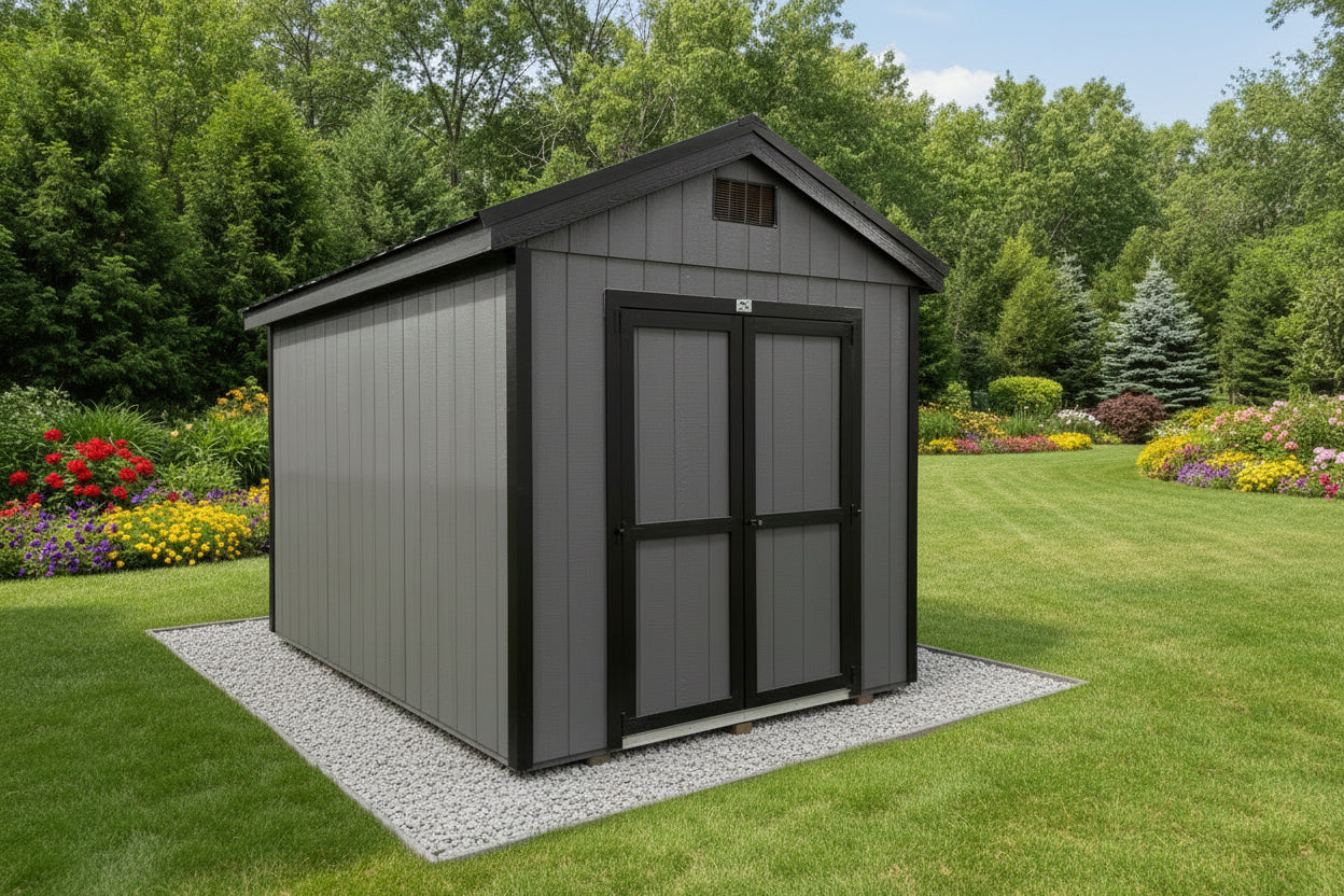 ~ 08X12 Utility Ranch Wood Panel Shed ~ Building Color - Peppercorn (SW 7674) Super Paint ~ Trim Color - *FASCIA, CORNER, & DOOR TRIM* - Tricorn Black (SW6258) Super Paint ~ Steel Roof - Black LC
