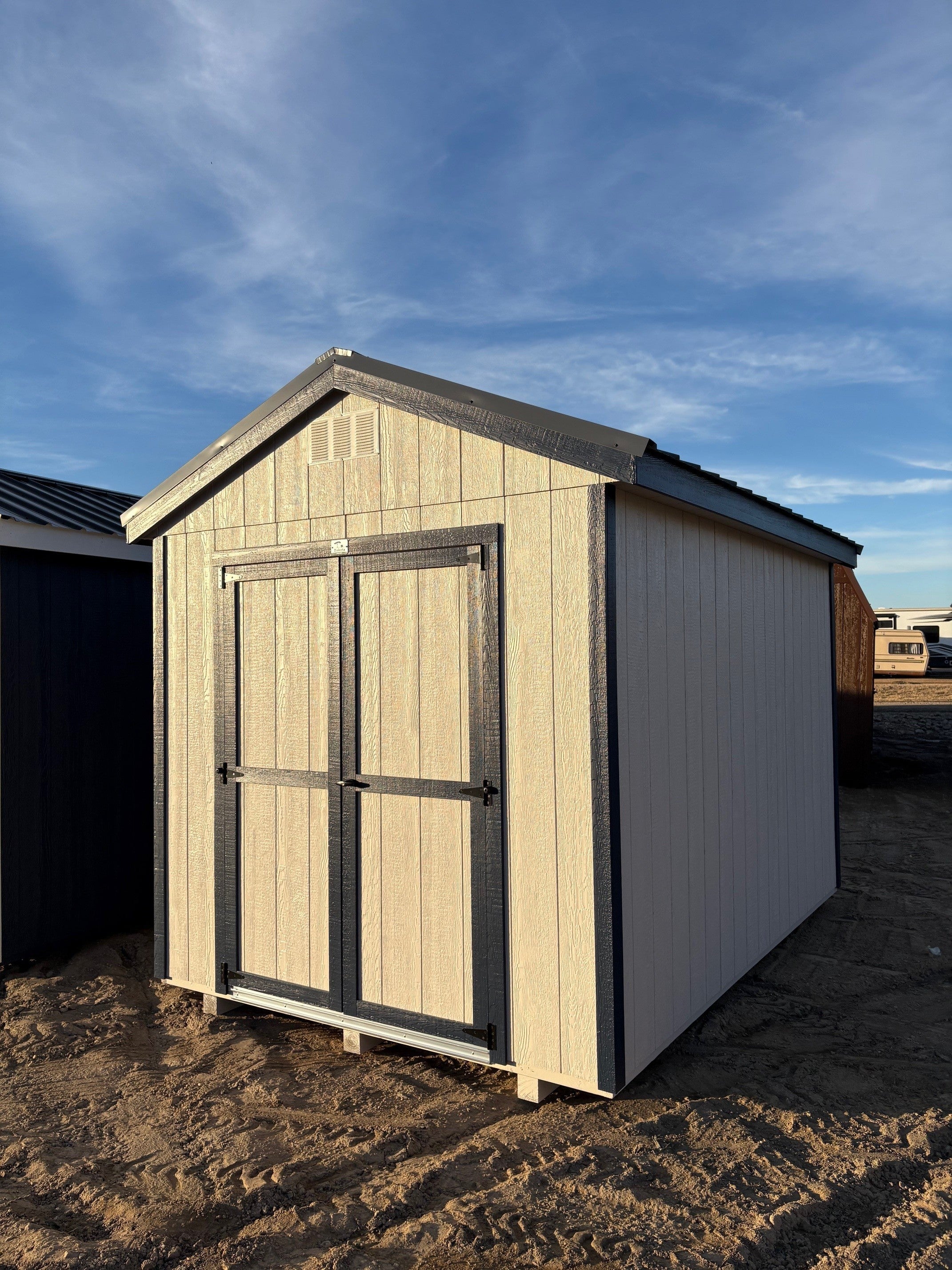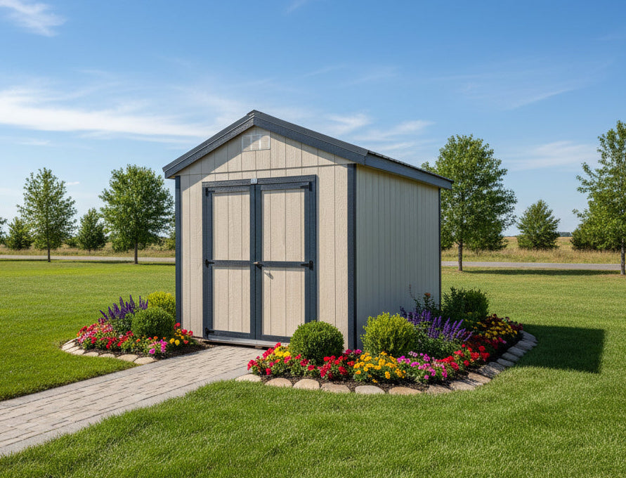 ~ 08X12 Utility Ranch Wood Panel Shed ~ Building Color - Popular Gray (SW6071) Super Paint ~ Trim Color - *FASCIA, CORNER, & DOOR TRIM* - Naval (SW6244) ~ Steel Roof - Charcoal LC