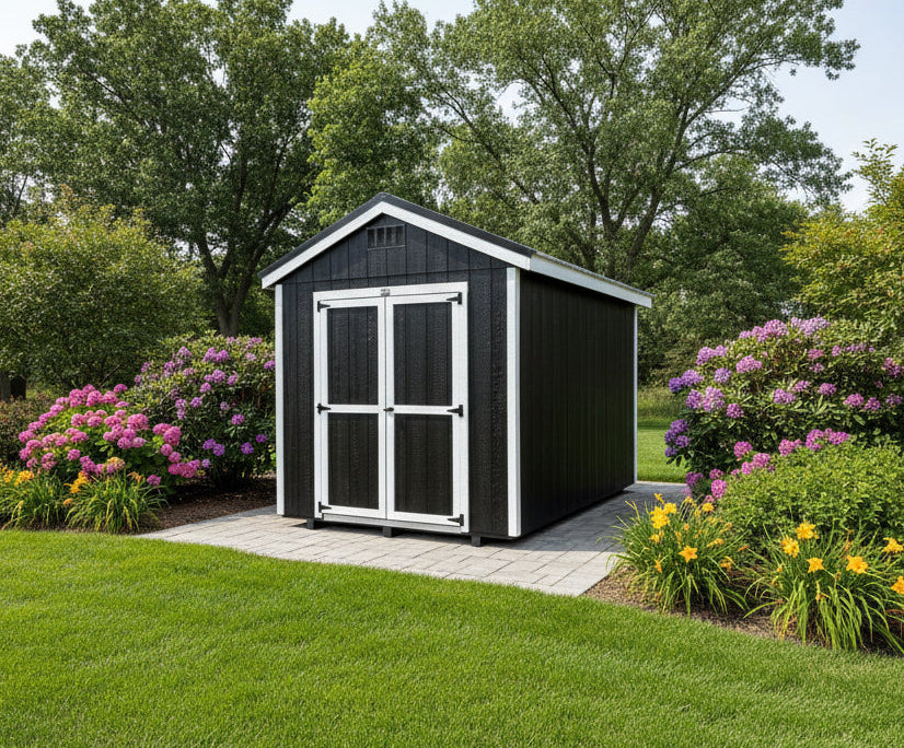 ~ 08X12 Utility Ranch Wood Panel Shed ~ Building Color - Tricorn Black (SW6258) Super Paint ~ Trim Color - *FASCIA, CORNER, & DOOR TRIM* - Super White (SW 6995) ~ Steel Roof - Black LC