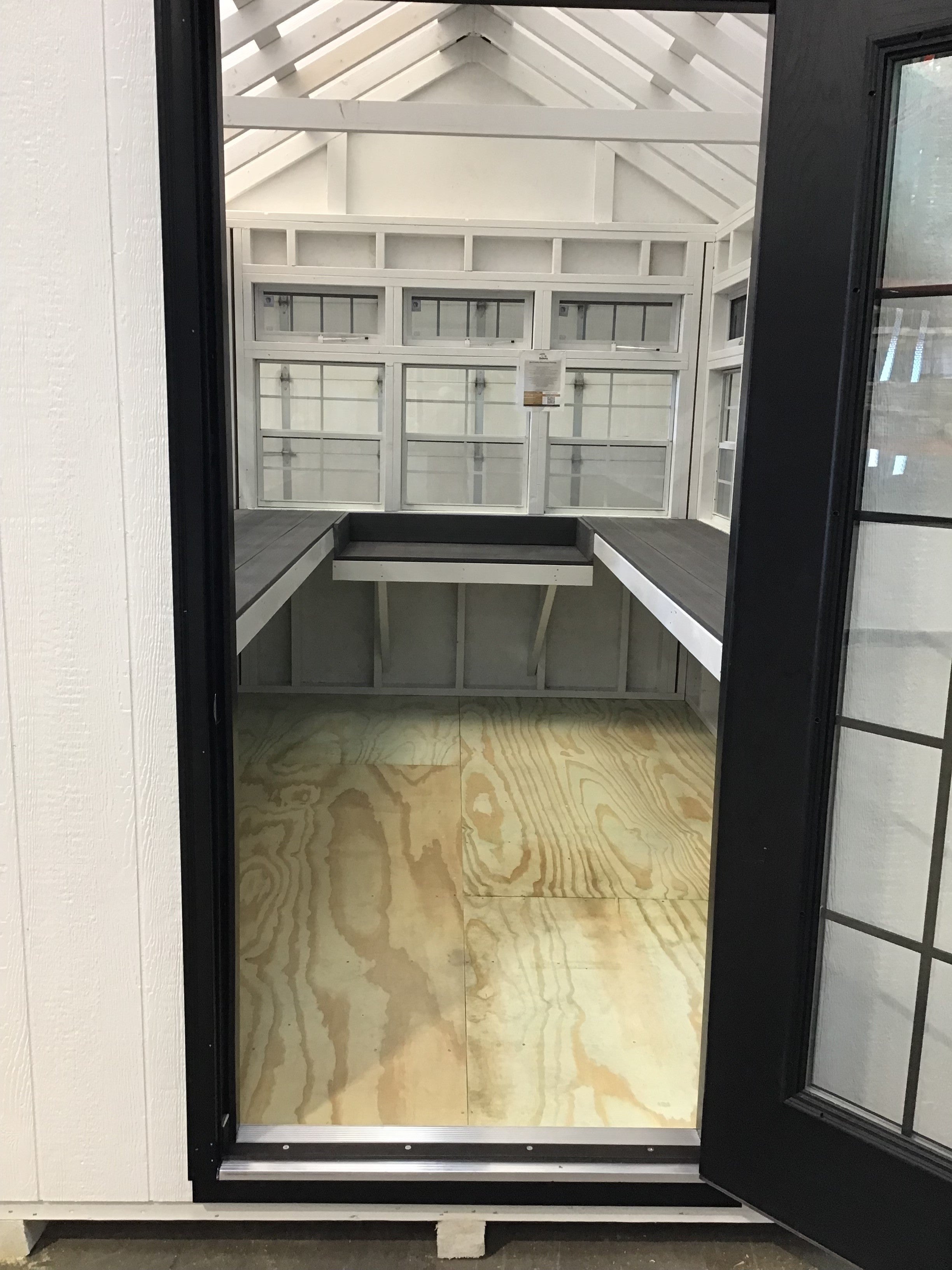 ~ 8X12 Green House Galley With Wood Panel Siding ** Roofline - 7/12 Classic Gable** ~ Building Color - Super White (SW 6995) ~ Trim Color - *FASCIA, CORNER, WINDOW & DOOR TRIM* - Tricorn Black (SW6258) Super Paint ~ Inside of Greenhouse Will be Painted White. ~ 5/8in Thick Softlite Twinwall Polycarbonate Panels; Roof Trim Color - Black