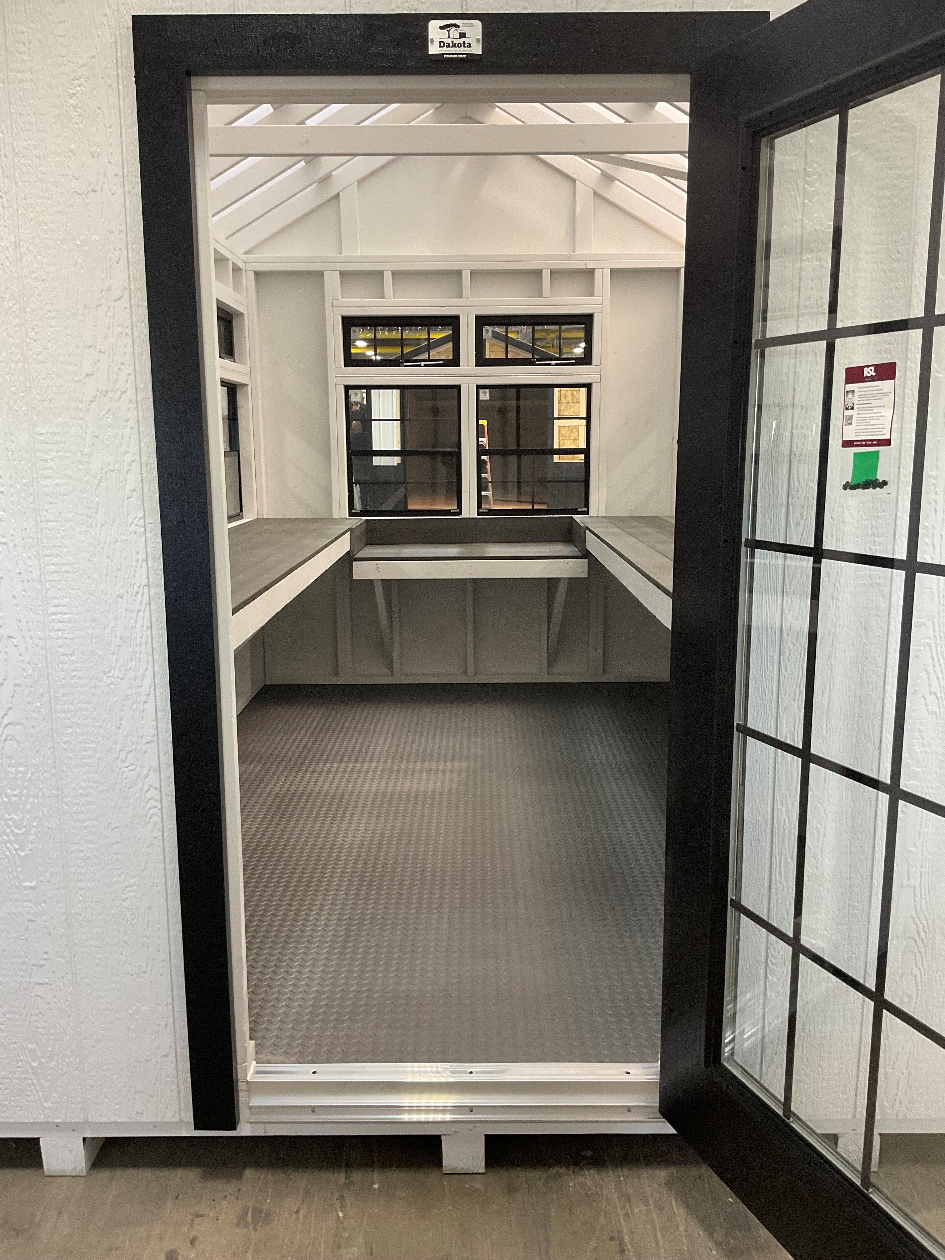 ~ 8X12 Green House Galley With Wood Panel Siding ** Roofline - 7/12 Classic Gable** ~ Building Color - Super White (SW 6995) ~ Trim Color - *FASCIA, CORNER, WINDOW & DOOR TRIM* - Tricorn Black (SW6258) Super Paint ~ Inside of Greenhouse Will be Painted White. ~ 5/8in Thick Softlite Twinwall Polycarbonate Panels; Roof Trim Color - Black