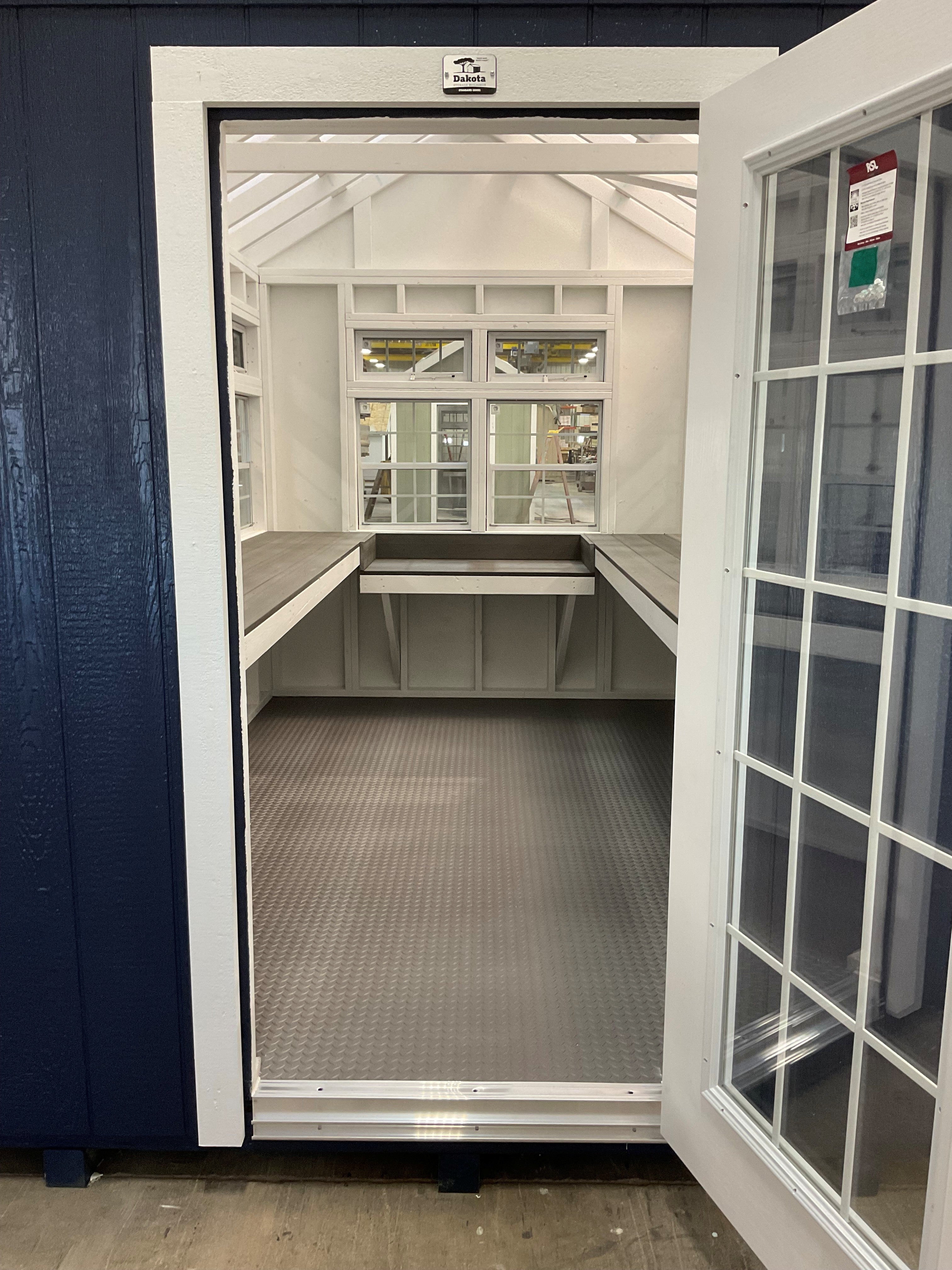~ 8X12 Green House Galley With Wood Panel Siding ** Roofline - 7/12 Classic Gable** ~ Building Color - Naval (SW6244) ~ Trim Color - *FASCIA, CORNER, WINDOW & DOOR TRIM* - Super White (SW 6995) ~ Inside of Greenhouse Will be Painted White. ~ 5/8in Thick Softlite Twinwall Polycarbonate Panels; Roof Trim Color - Pure White