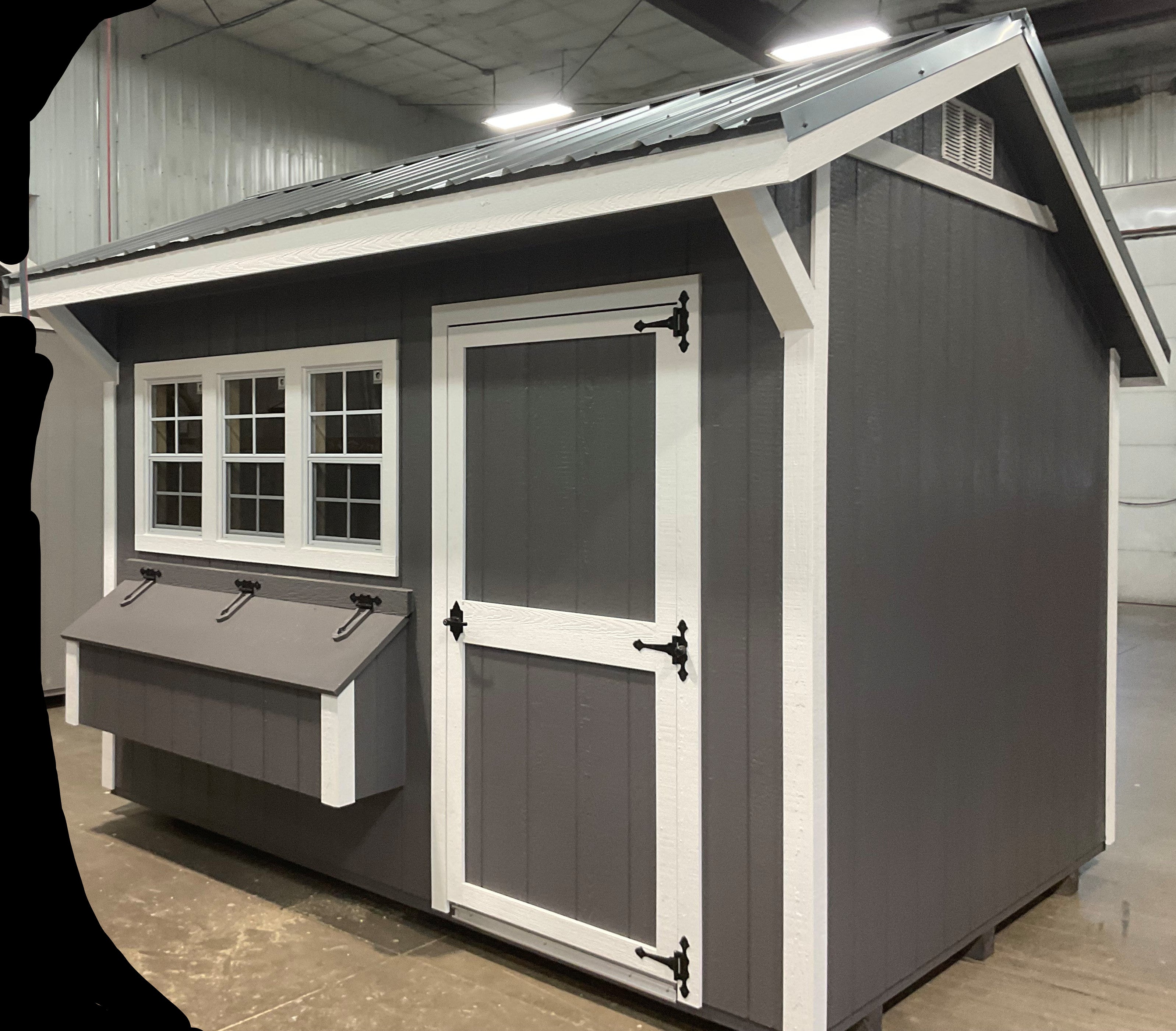 ~ 8X12 Free Range Chicken Coop Package With Wood Panel Siding ** Roofline - Quaker Gable** ~ Building Color - Peppercorn (SW 7674) Super Paint ~ Trim Color - *FASCIA, CORNER, WINDOW & DOOR TRIM* - Super White (SW 6995) ~ Steel Roof - Charcoal LC