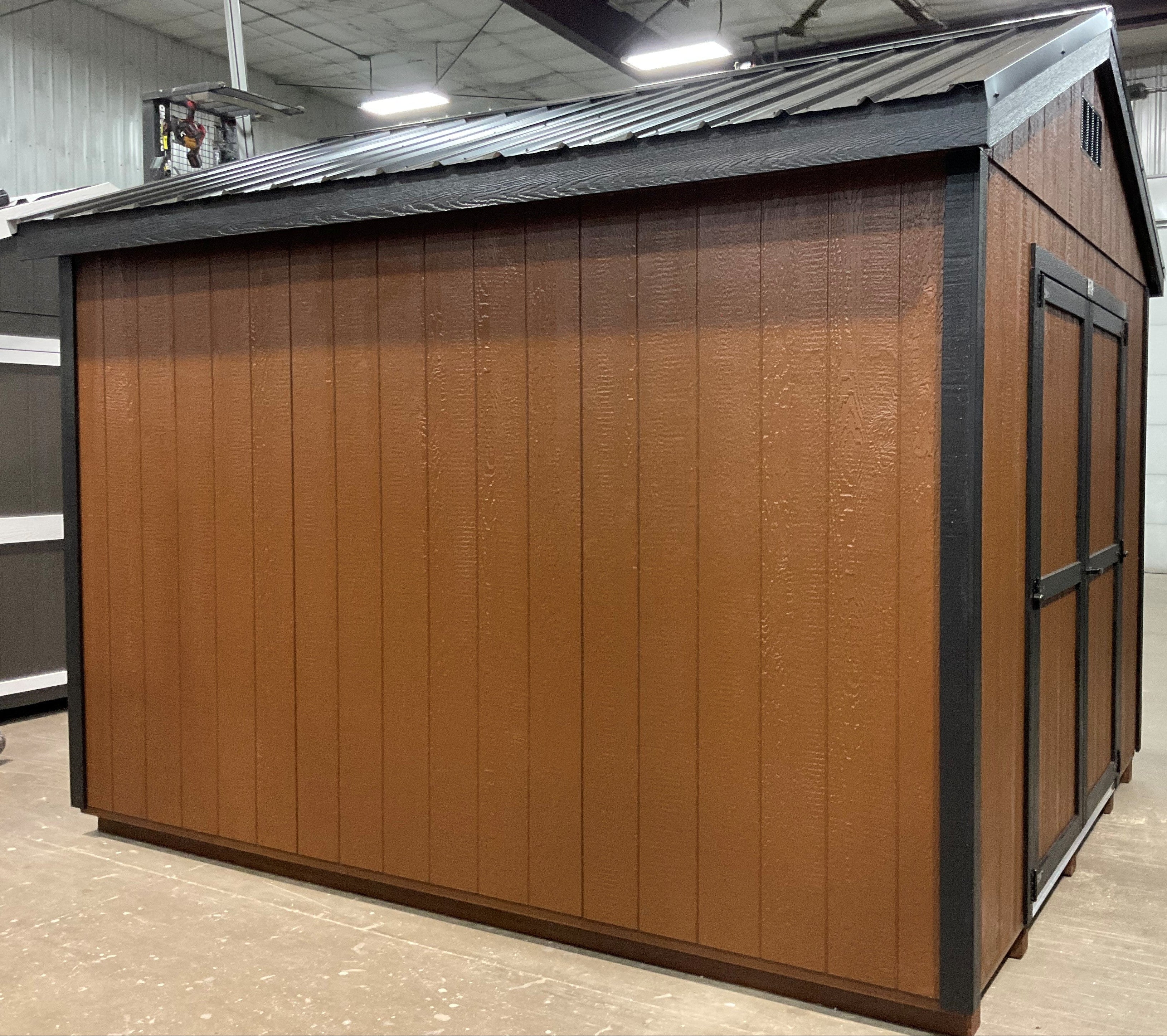 ~ 10X12 Utility Ranch Wood Panel Shed ~ Building Color - French Roast (SW 6069) ~ Trim Color - *FASCIA, CORNER, & DOOR TRIM* - Tricorn Black (SW6258) Super Paint ~ Steel Roof - Black LC