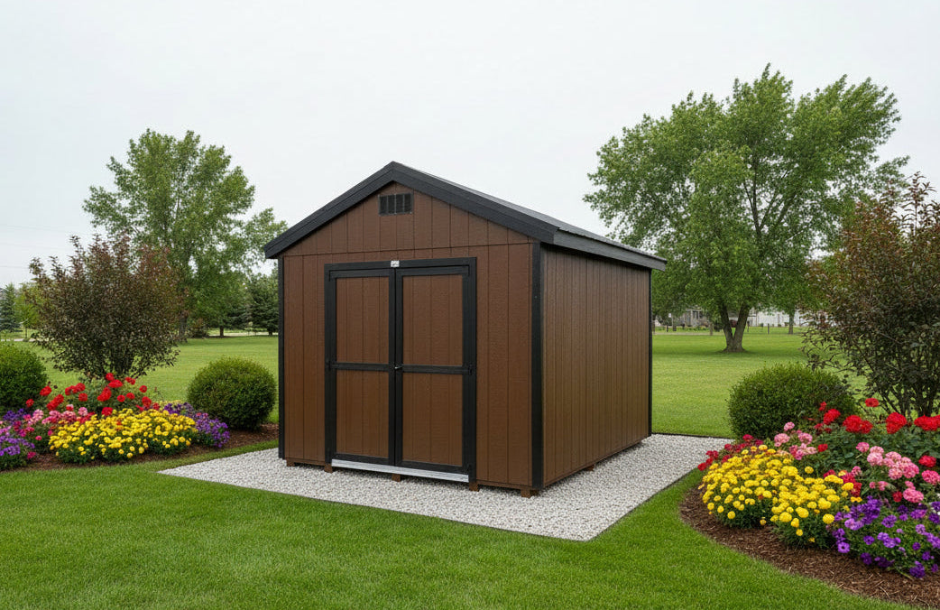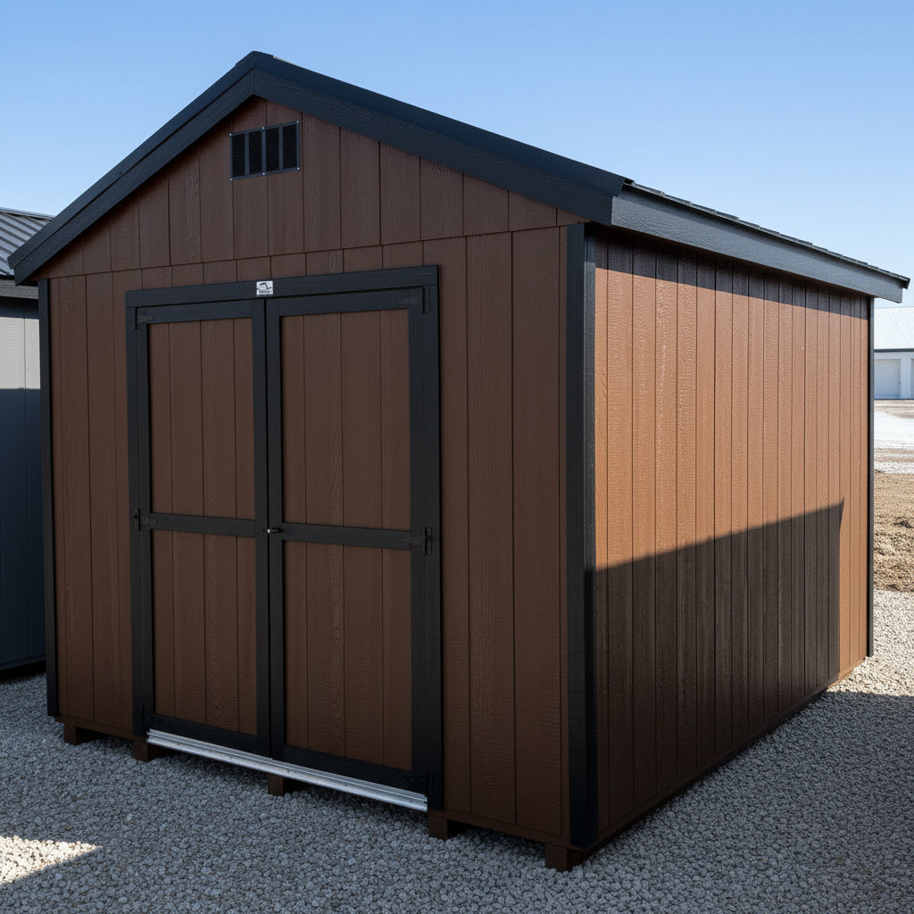~ 10X12 Utility Ranch Wood Panel Shed ~ Building Color - French Roast (SW 6069) ~ Trim Color - *FASCIA, CORNER, & DOOR TRIM* - Tricorn Black (SW6258) Super Paint ~ Steel Roof - Black LC