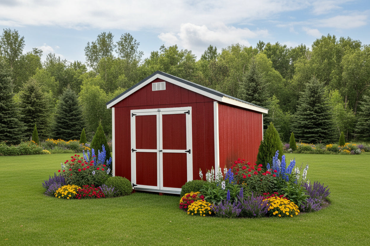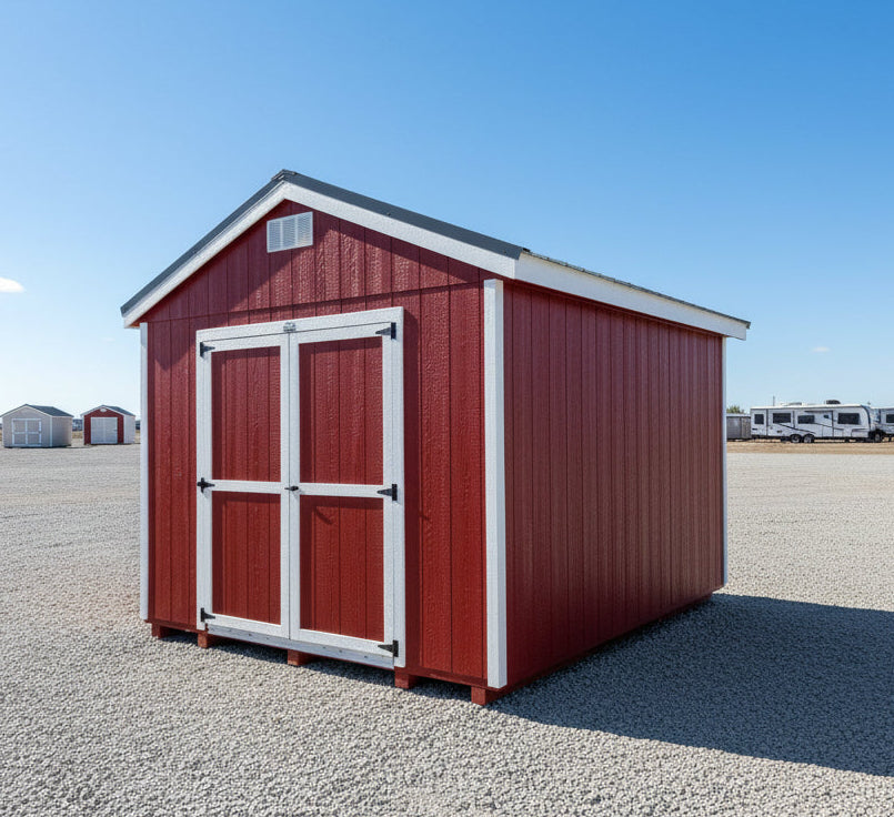 ~ 10X12 Utility Ranch Wood Panel Shed ~ Building Color - Crabby Apple (SW 7592) Super Paint ~ Trim Color - *FASCIA, CORNER, & DOOR TRIM* - Super White (SW 6995) ~ Steel Roof - Charcoal LC