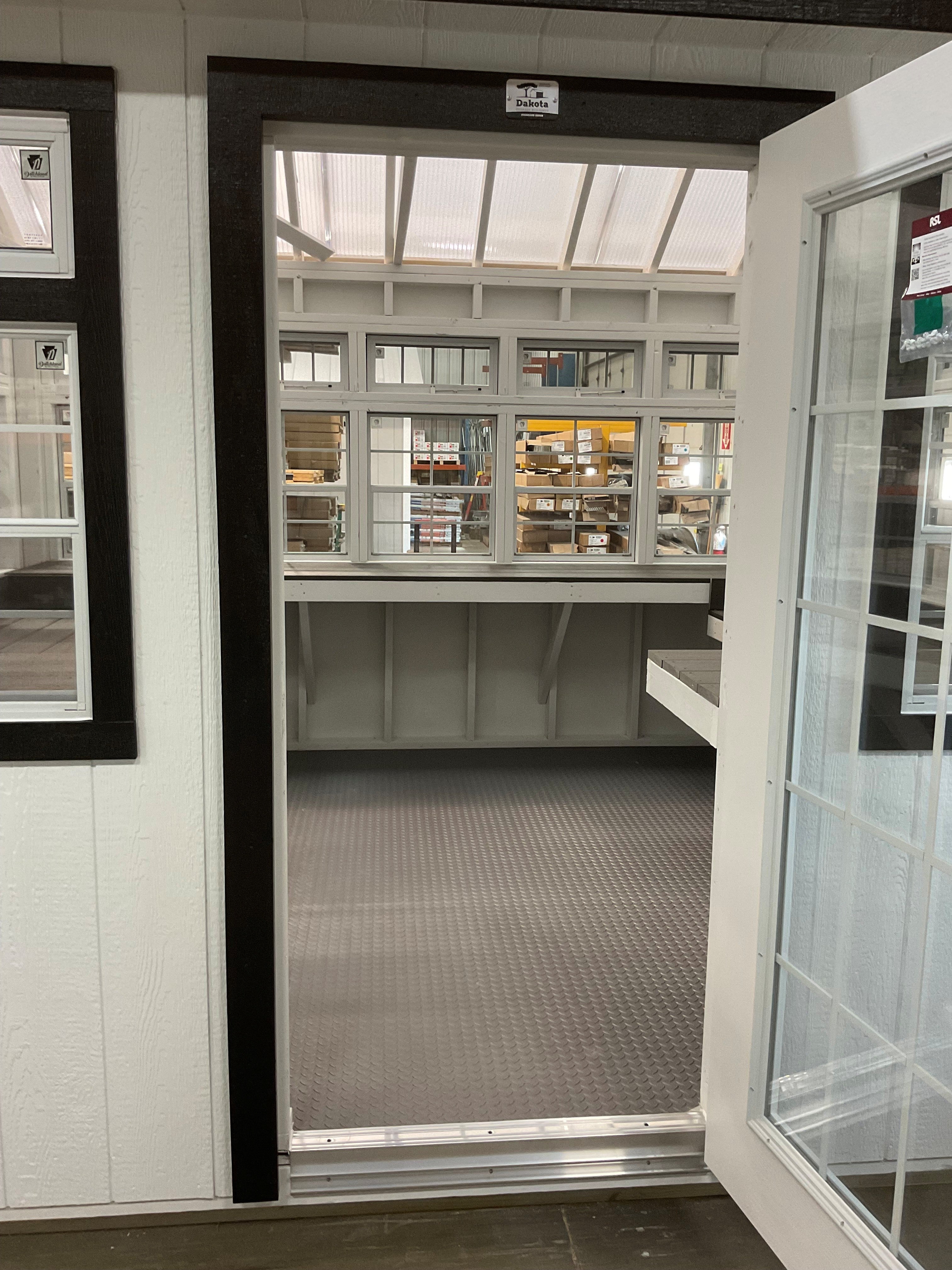 ~ 10X12 Green House Wrap Around With Wood Panel Siding ** Roofline - 7/12 Classic Gable** ~ Building Color - Super White (SW 6995) ~ Trim Color - *FASCIA, CORNER, WINDOW & DOOR TRIM* - Tricorn Black (SW6258) Super Paint ~ Inside of Greenhouse Will be Painted White. ~ 5/8in Thick Softlite Twinwall Polycarbonate Panels; Roof Trim Color - Black
