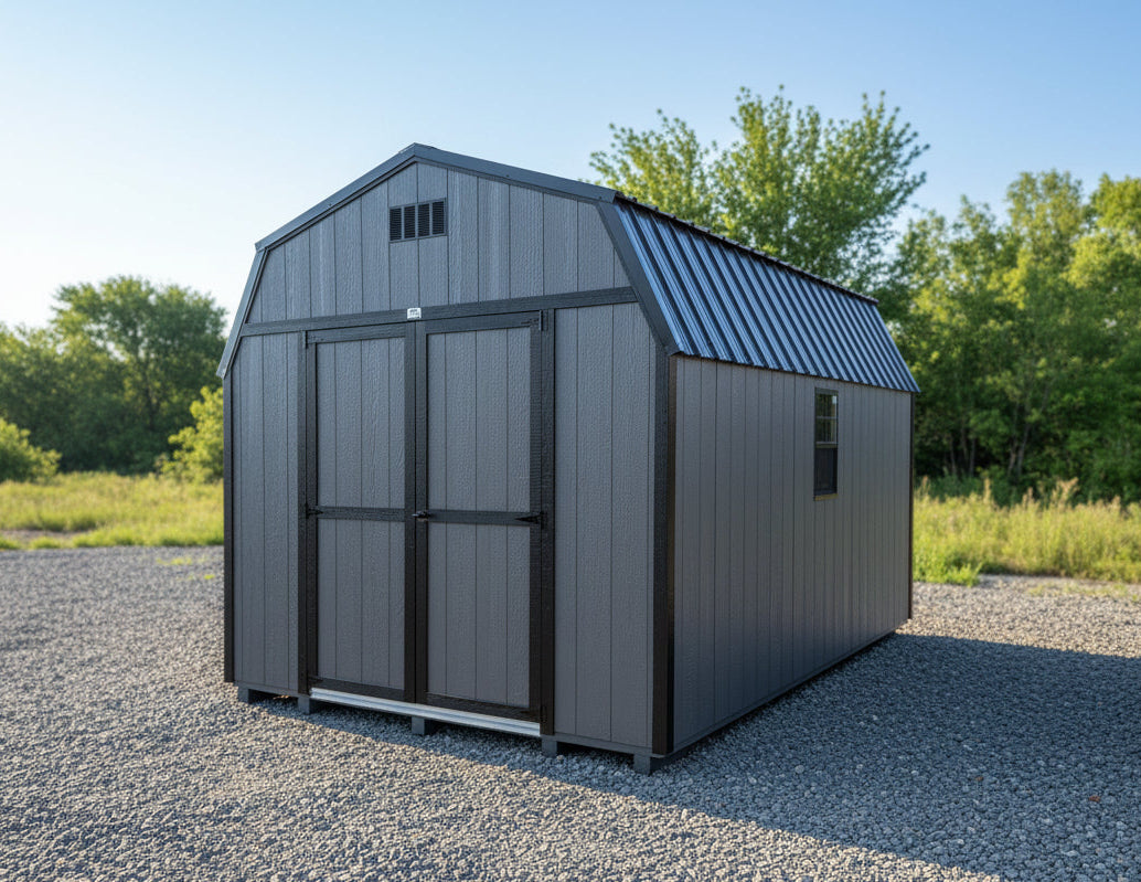 ~ 10X16 Utility High Barn Wood Panel Shed ~ Building Color - Peppercorn (SW 7674) Super Paint ~ Trim Color - *FASCIA, CORNER, & DOOR TRIM* - Tricorn Black (SW6258) Super Paint ~ Steel Roof - Black LC
