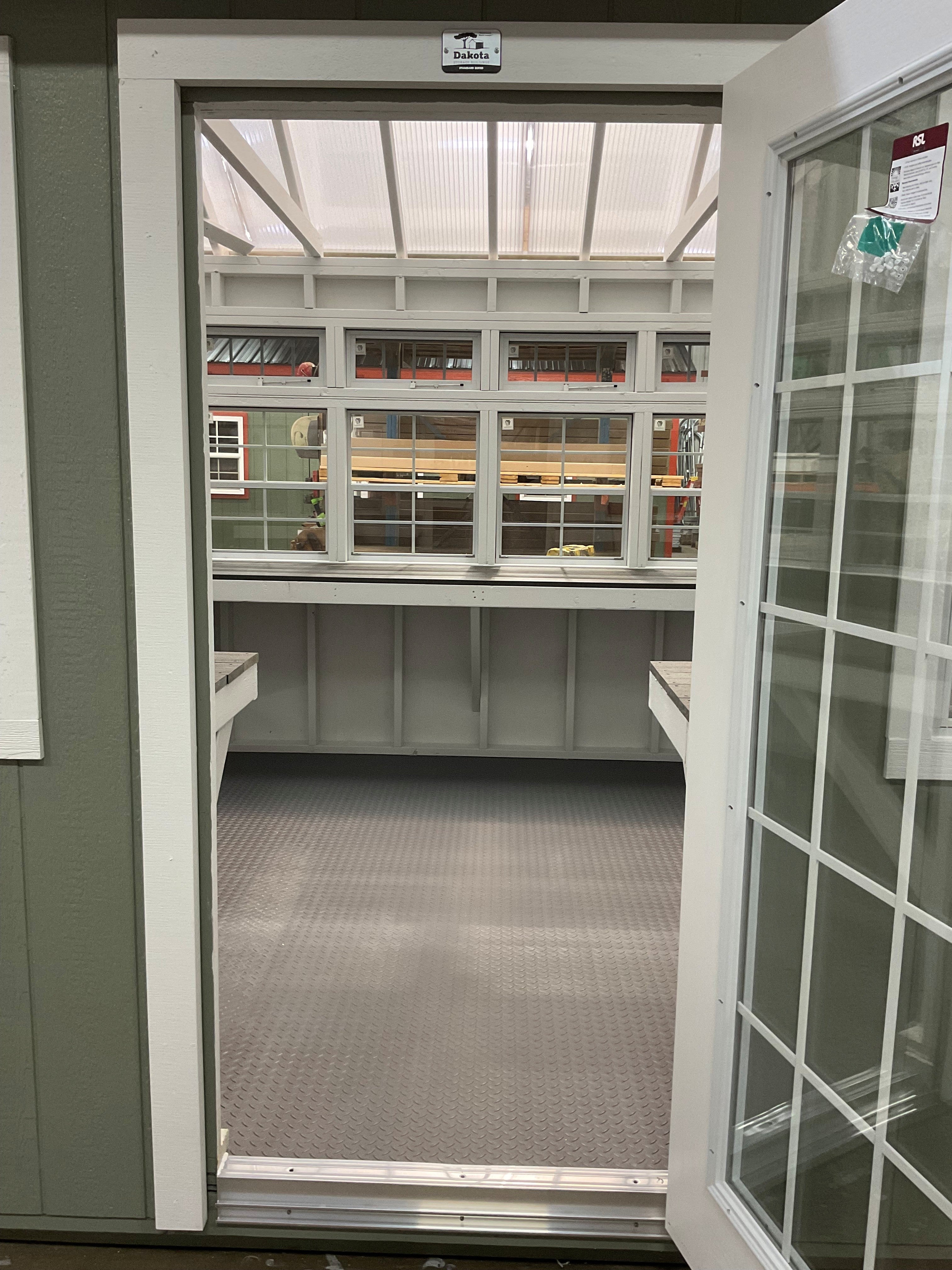 ~ 10X16 Green House Wrap Around With Wood Panel Siding ** Roofline - 7/12 Classic Gable** ~ Building Color - Evergreen Fog (SW9130) Super Paint ~ Trim Color - *FASCIA, CORNER, WINDOW & DOOR TRIM* - Super White (SW 6995) ~ Inside of Greenhouse Will be Painted White. ~ 5/8in Thick Softlite Twinwall Polycarbonate Panels; Roof Trim Color - Burnished Slate