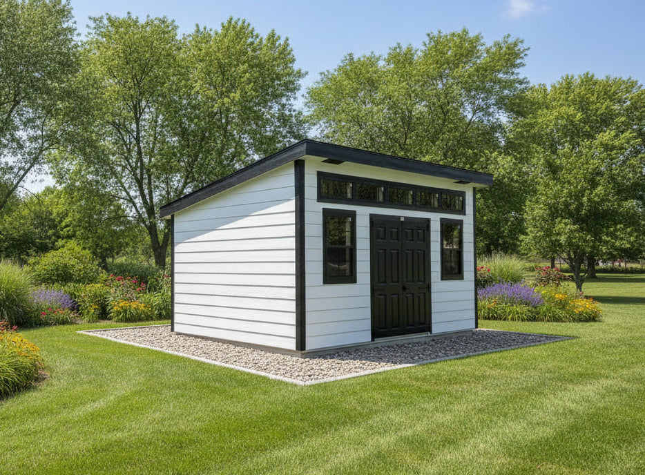 ~ 10X16 Modern Backyard Shed Package With Wood Lap Siding ** Roofline - Studio** ~ Building Color - Super White (SW 6995) ~ Trim Color - *FASCIA, CORNER, WINDOW & DOOR TRIM* - Tricorn Black (SW6258) Super Paint ~ **** LP Smart Siding Lap ClapBoard W/ 7" Exposure **** ~ Shingles - CertainTeed (Black) (NorthGate) ~ Drip Edge - Black