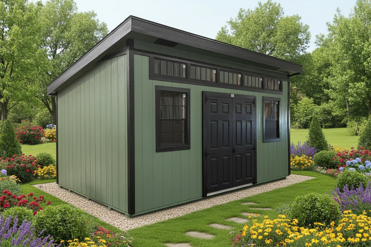 ~ 10X16 Modern Backyard Shed Package With Wood Panel Siding ** Roofline - Studio** ~ Building Color - Rosemary (SW6187) Super Paint ~ Trim Color - *FASCIA, CORNER, WINDOW & DOOR TRIM* - Tricorn Black (SW6258) Super Paint ~ Shingles - CertainTeed (Black) (NorthGate) ~ Drip Edge - Black