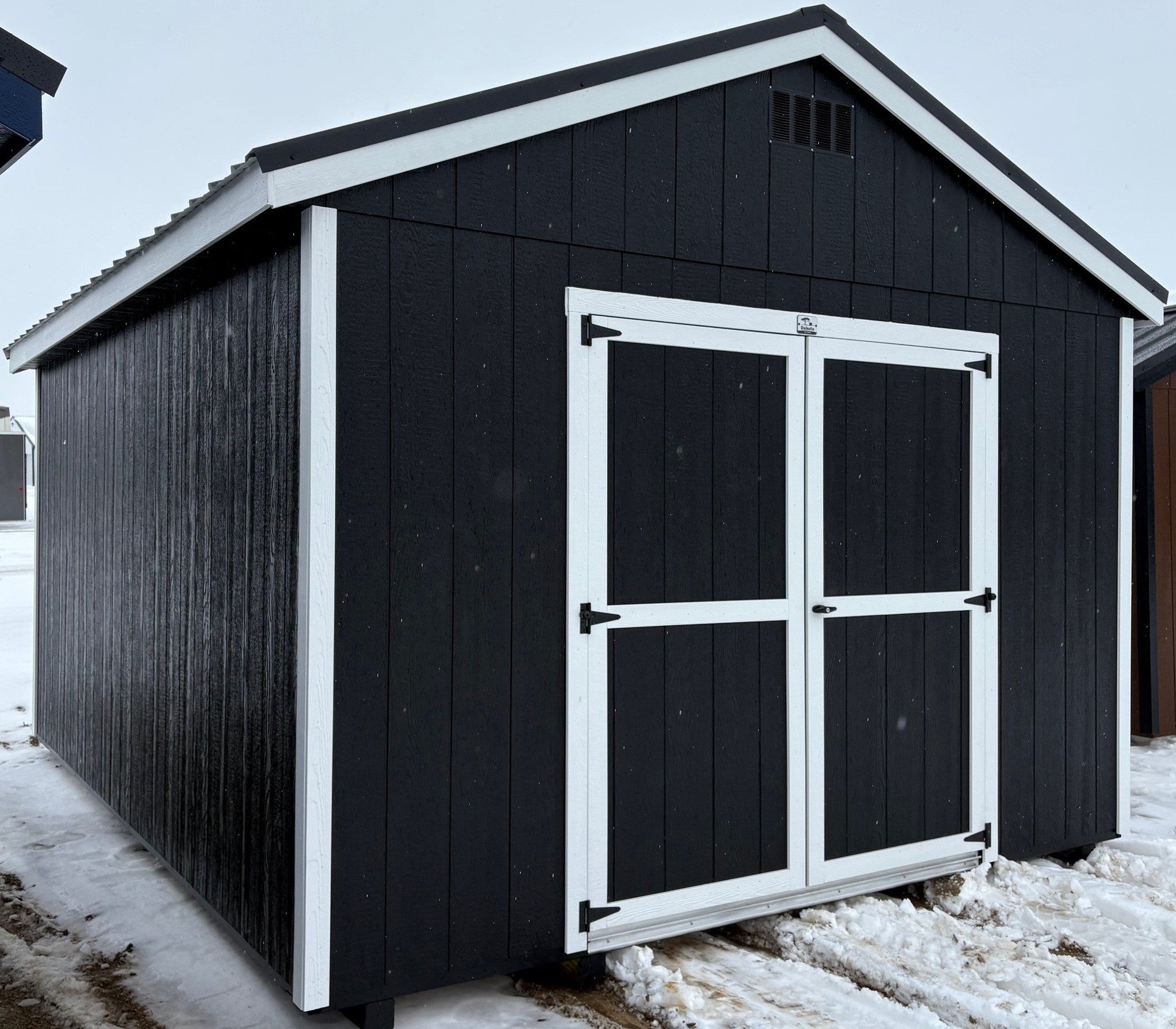~ 12X16 Utility Ranch Wood Panel Shed ~ Building Color - Tricorn Black (SW6258) Super Paint ~ Trim Color - *FASCIA, CORNER, & DOOR TRIM* - Super White (SW 6995) ~ Steel Roof - Black LC