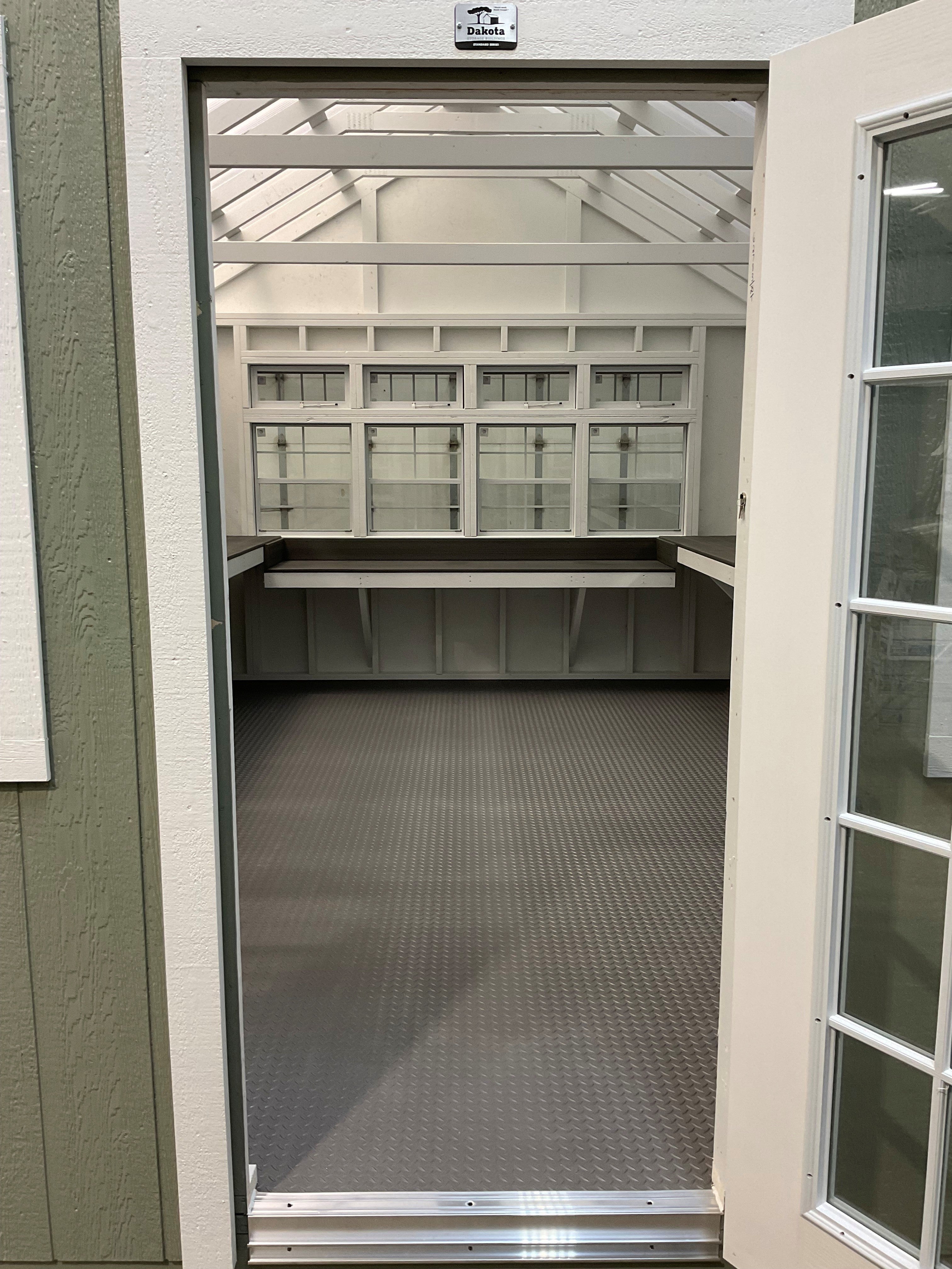 ~ 12X16 Green House Galley With Wood Panel Siding ** Roofline - 7/12 Classic Gable** ~ Building Color - Evergreen Fog (SW9130) Super Paint ~ Trim Color - *FASCIA, CORNER, WINDOW & DOOR TRIM* - Super White (SW 6995) ~ Inside of Greenhouse Will be Painted White. ~ 5/8in Thick Softlite Twinwall Polycarbonate Panels; Roof Trim Color - Pure White