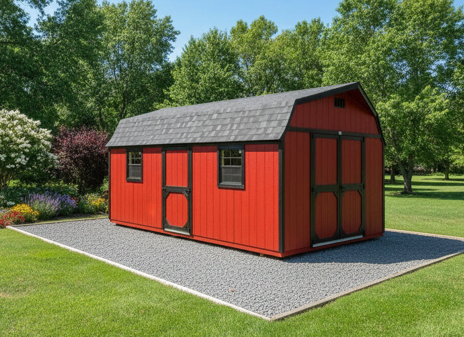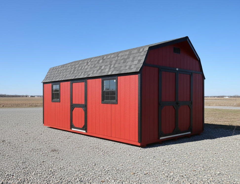~ 12X20 Everyday Backyard Shed Package XL With Wood Panel Siding ** Roofline - High Barn** ~ Building Color - Crabby Apple (SW 7592) Super Paint ~ Trim Color - *FASCIA, CORNER, WINDOW & DOOR TRIM* - Tricorn Black (SW6258) Super Paint ~ Shingles - CertainTeed (Black) (NorthGate) ~ Drip Edge - Black