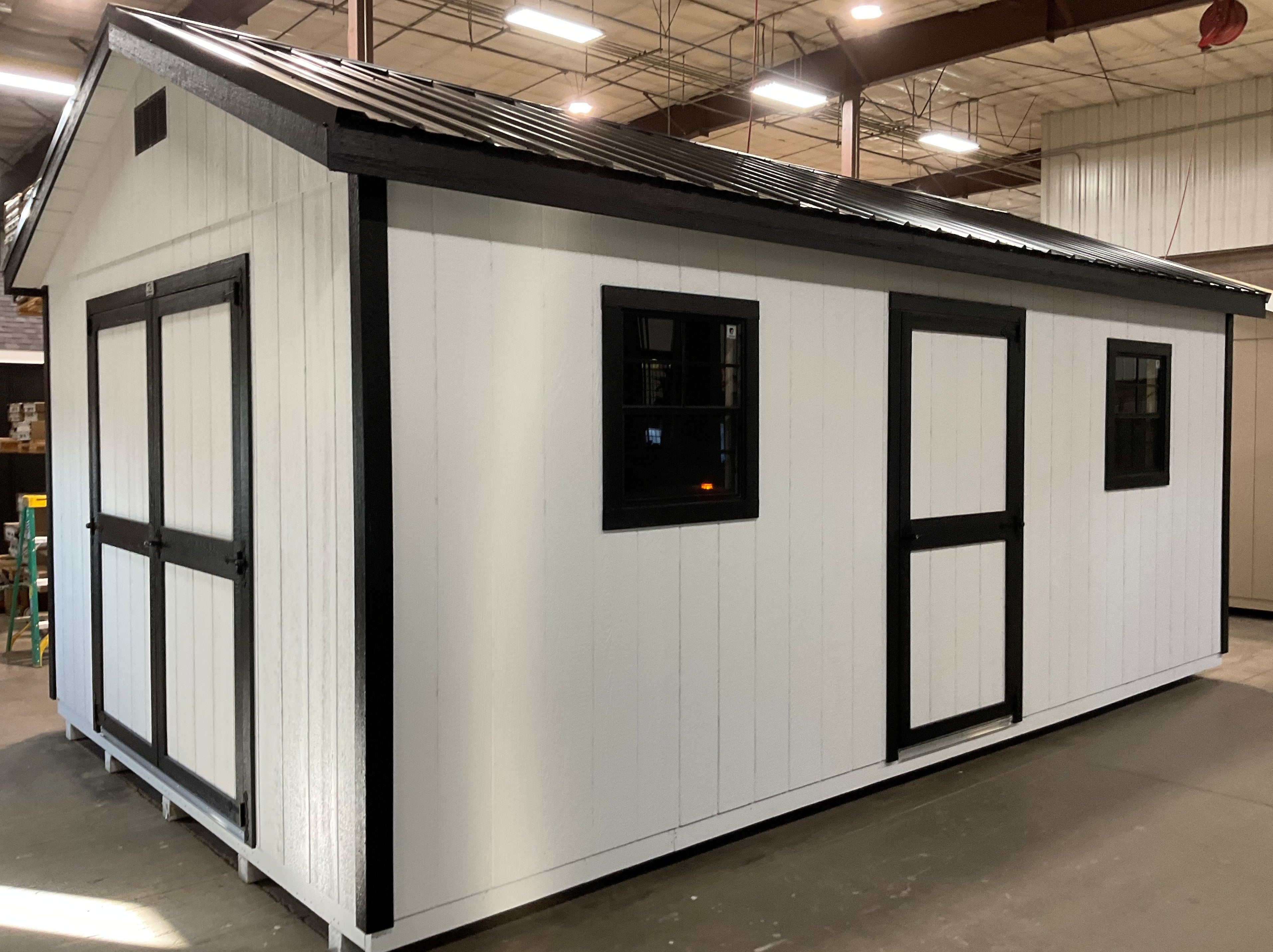 ~ 12X20 Everyday Backyard Shed Package XL With Wood Panel Siding ** Roofline - 5/12 Ranch Gable** ~ Building Color - Super White (SW 6995) ~ Trim Color - *FASCIA, CORNER, WINDOW & DOOR TRIM* - Tricorn Black (SW6258) Super Paint ~ Steel Roof - Black LC