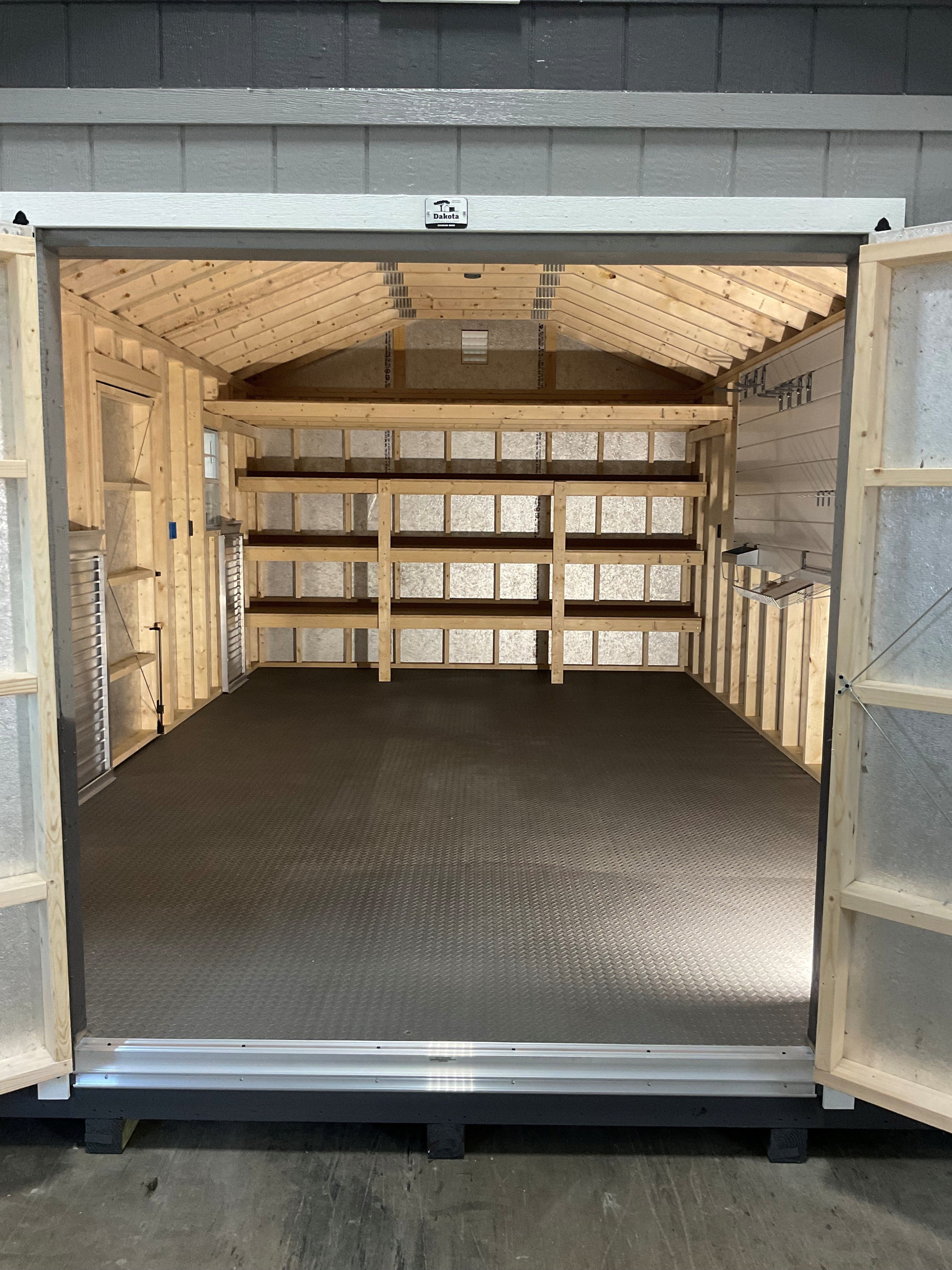 *FLOORING & INTERIOR* ~ Floors - 16" On Center With 2x6 Pressure Treated Floor Joist ~ Floor Sheeting - LuxGuard - Double Layer of 3/4 Tongue & Grove OSB ~ ***LP ProStruct With SILVERTECH Finish on Roof*** ~ Build Out of LP SmartSide Panel Siding With SILVERTECH ~ 1. 3-Tier 12' L x 24" D - Shelves 20", 40", & 60" from floor - With a 3/4" Prostruct Top ~ 1. 4x12 Loft