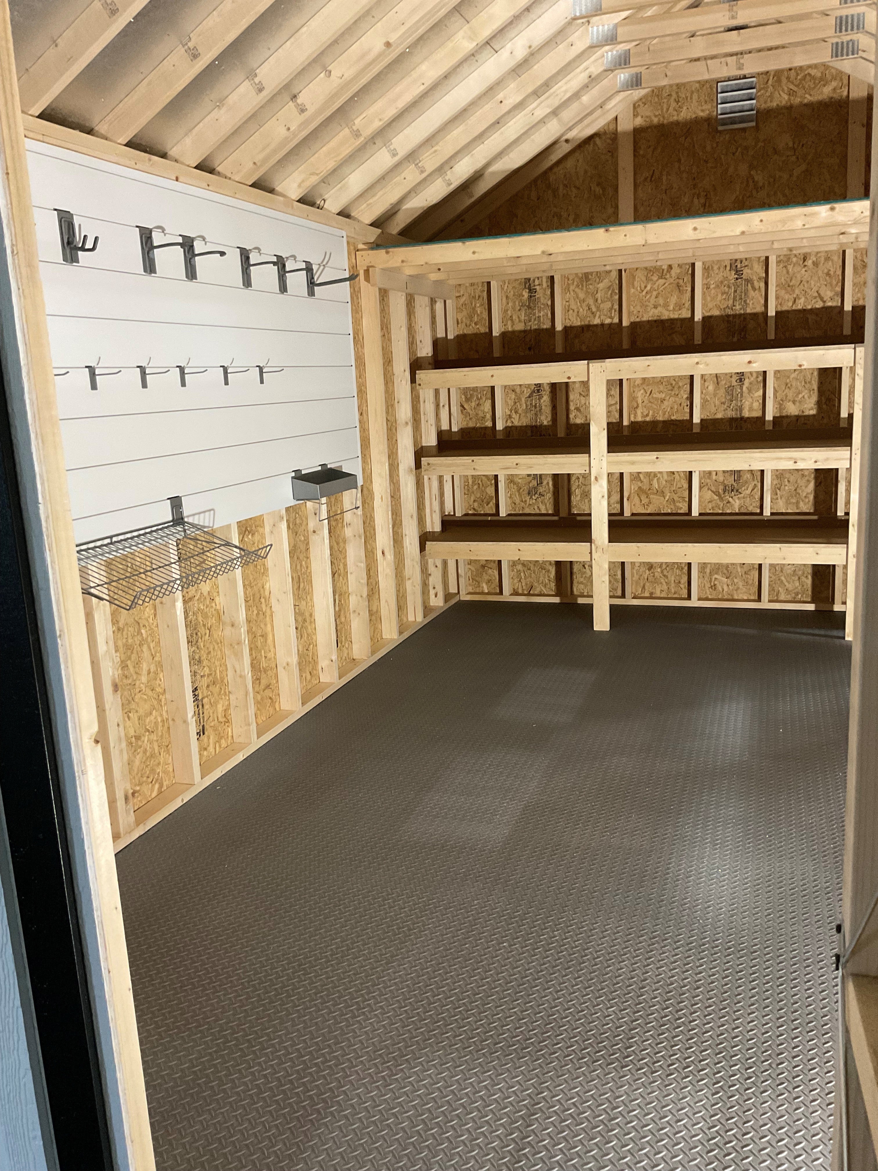 *FLOORING & INTERIOR* ~ Floors - 16" On Center With 2x6 Pressure Treated Floor Joist ~ Floor Sheeting - LuxGuard - Double Layer of 3/4 Tongue & Grove OSB ~ ***LP ProStruct With SILVERTECH Finish on Roof*** ~ 1. 3-Tier 12' L x 24" D - Shelves 20", 40", & 60" from floor - With a 3/4" Prostruct Top ~ 1. 4x12 Loft