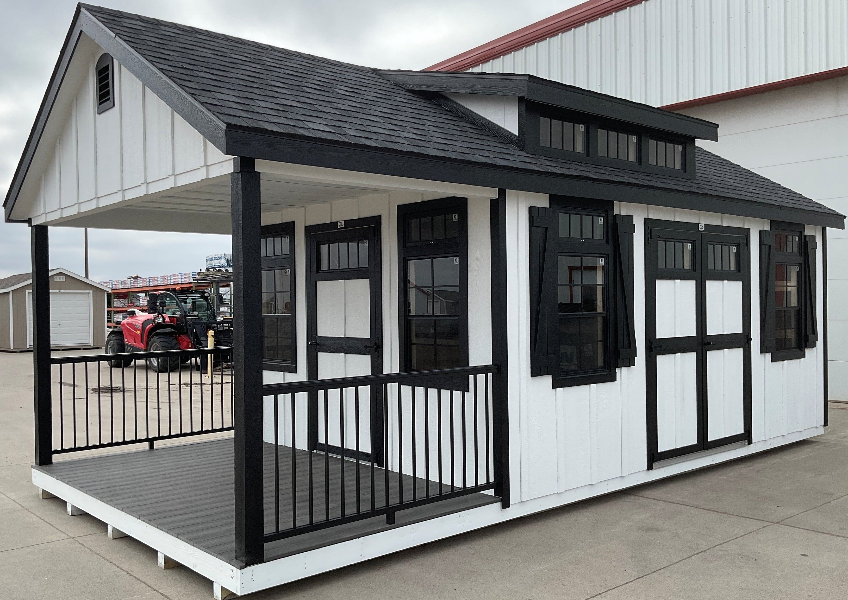 ~ 12X24 7/12 Classic Gable W /LP Board & Batten Siding Porch ~ Building Color - Super White (SW 6995) ~ Trim Color - *FASCIA, CORNER, WINDOW & DOOR TRIM* - Tricorn Black (SW6258) Super Paint ~ Shingles - CertainTeed (Black) (NorthGate) ~ Drip Edge - Black ~ 2 Section of 6'6'' Railing ~Color - Black ~ **Basic 6ft Porch** **Total Lenght of Building With Porch Is 24 Feet** ~ SOLID Vista Composit Enhanced Decking-Driftwood 12' Lenght
