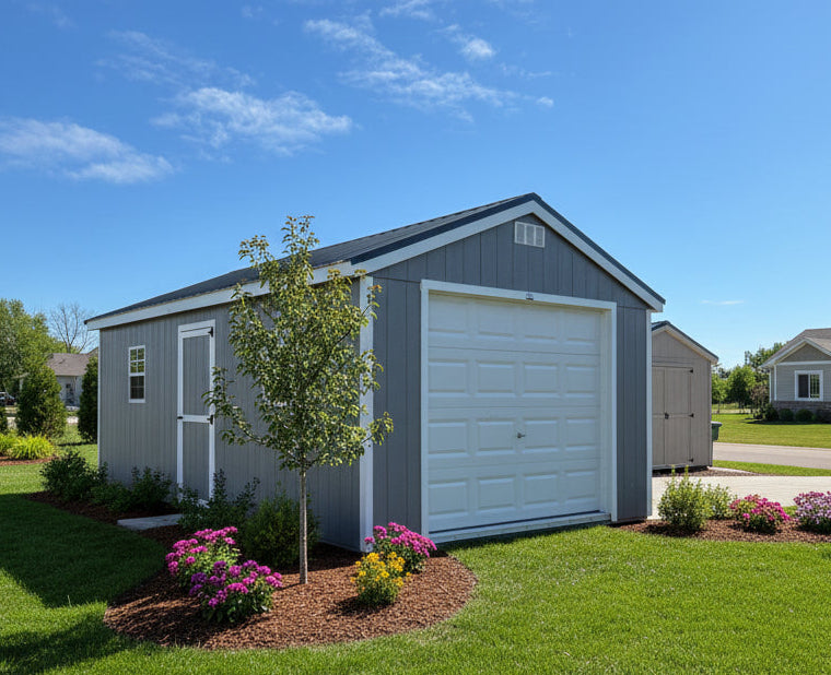 ~ 12X24 Utility Ranch Wood Panel Garage ~ Building Color - Summit Gray (SW 7669) ~ Trim Color - *FASCIA, CORNER, & DOOR TRIM* - Super White (SW 6995) ~ Steel Roof - Charcoal LC