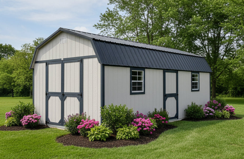 ~ 12X24 Everyday Backyard Shed Package XL With Wood Panel Siding ** Roofline - High Barn** ~ Building Color - Popular Gray (SW6071) Super Paint ~ Trim Color - *FASCIA, CORNER, WINDOW & DOOR TRIM* - Naval (SW6244) ~ Steel Roof - Black LC ~ Gable Overhang