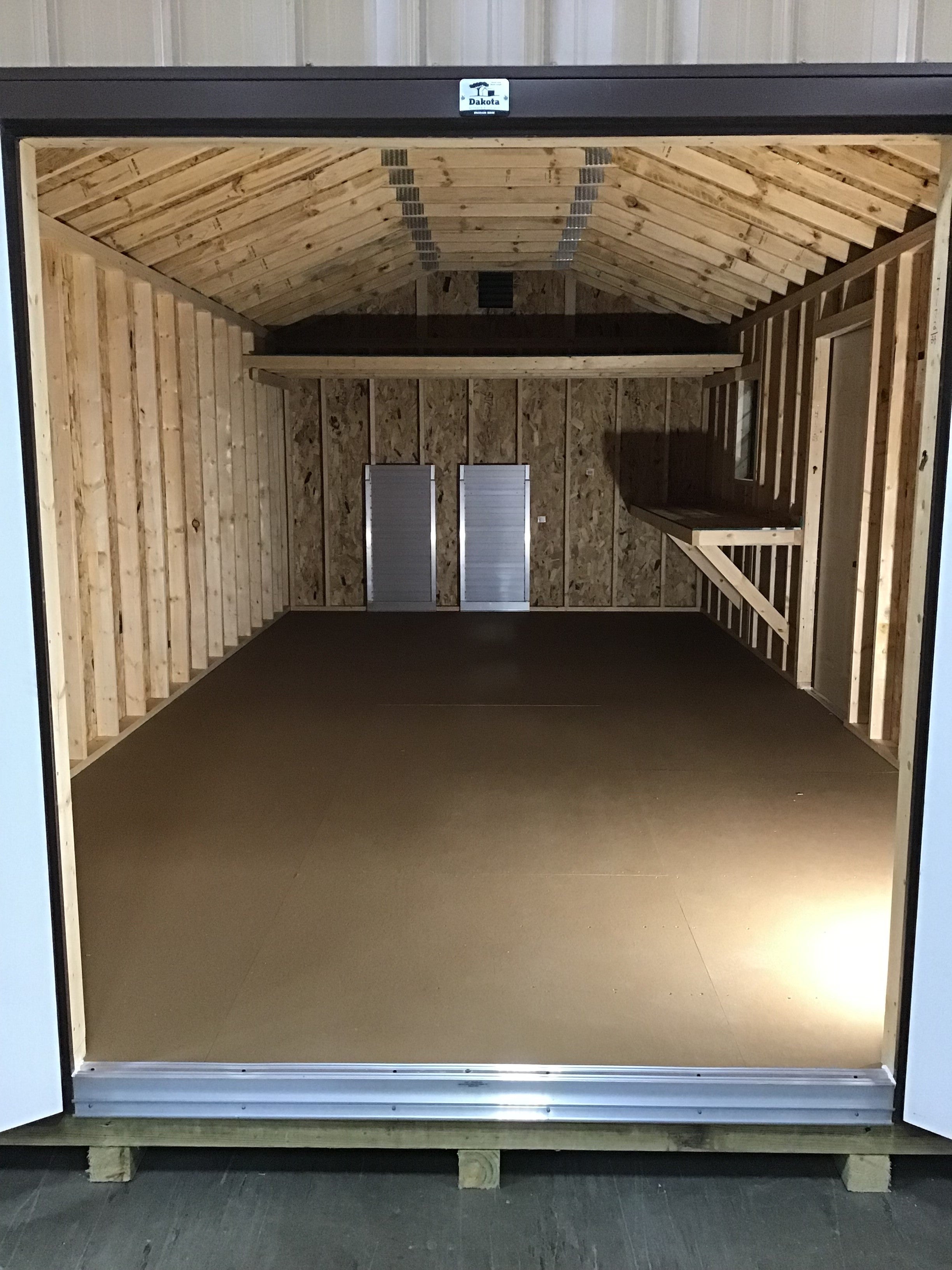 12X24 With Steel Siding ** Roofline - 5/12 Ranch Gable W/Wainscot**Wainscot Panel - Cocoa BrownSteel Wall Upper Panel Color - Mocha Tan**Trim Color - Cocoa Brown ** *Fascia & Soffit Color* - Cocoa BrownVents - 15"x15" Brown Gable VentRoof Steel Panel Color - Cocoa Brown** Roof Trim - Cocoa Brown ** 1. Window - 24x27 Vertical Slider (RF) - Brown1 Extra Window- 24x27 Vertical Slider (RF) - BrownFloors - 16" On CenterFloor Sheeting - 3/4" LP Prostruct Flooring w/ Textured Skid-Resistant Flooring Standard Door - 72x78 DBL Fiberglass Door 6 Panel *Door Paint - Cocoa Brown*1. 36x78 Fiberglass Door 6 Panel *Door Paint - Cocoa Brown*1. 2X10 Workbench1. 4x12 Loft 1. 4ft Adjustable Aluminum Ramp (2 Sections 2ft X 4ft per section)