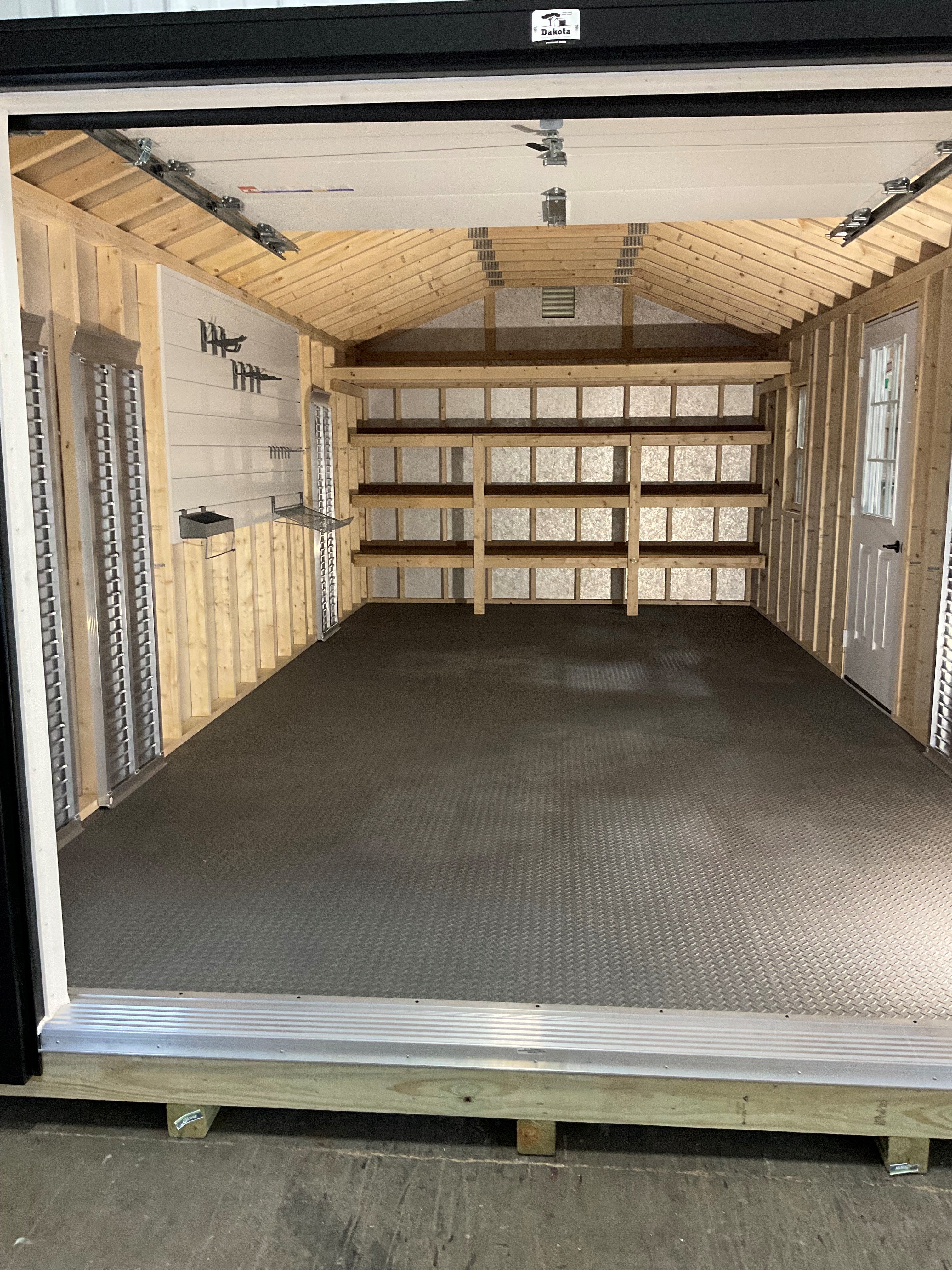 *FLOORING & INTERIOR* ~ Floors - 12" On Center With 2x6 Pressure Treated Floor Joist ~ Floor Sheeting - LuxGuard - Double Layer of 3/4 Tongue & Grove OSB ~ ***LP ProStruct With SILVERTECH Finish on Walls*** ~ ***LP ProStruct With SILVERTECH Finish on Roof*** ~ 1. 3-Tier 12' L x 24" D - Shelves 20", 40", & 60" from floor - With a 3/4" Prostruct Top ~ 1. 4x12 Loft