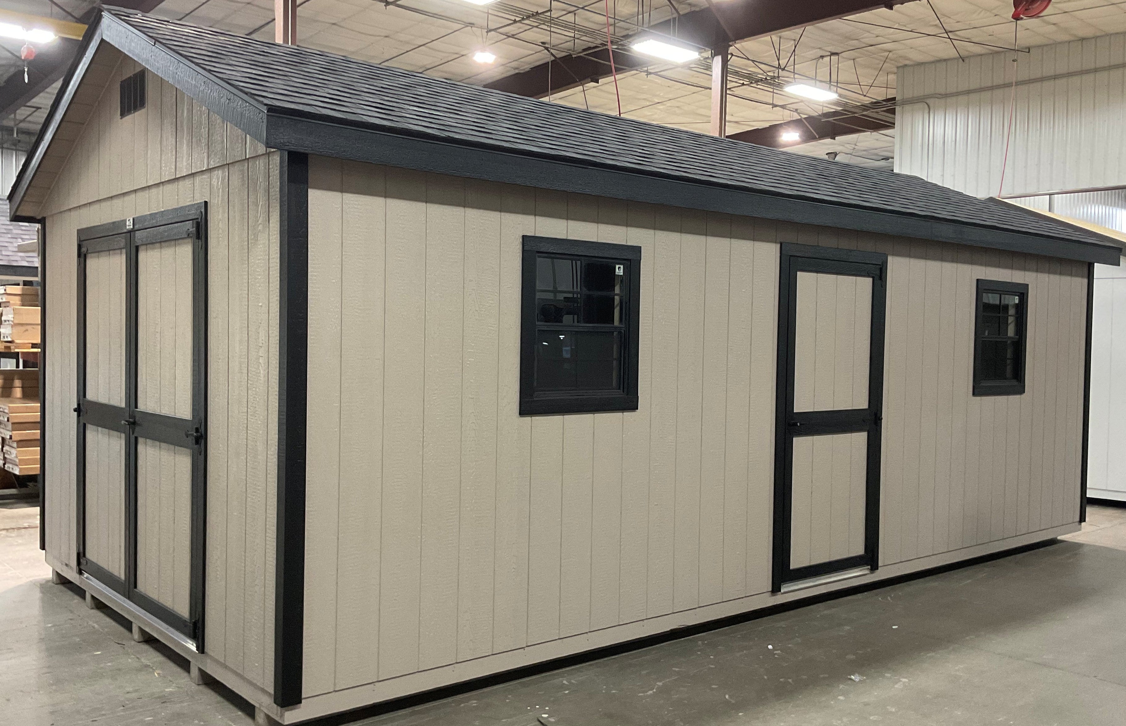 ~ 12X24 Everyday Backyard Shed Package XL With Wood Panel Siding ** Roofline - 5/12 Ranch Gable** ~ Building Color - Taupe Tone (SW 7633) Super Paint ~ Trim Color - *FASCIA, CORNER, WINDOW & DOOR TRIM* - Tricorn Black (SW6258) Super Paint ~ Shingles - CertainTeed (Black) (NorthGate) ~ Drip Edge - Black