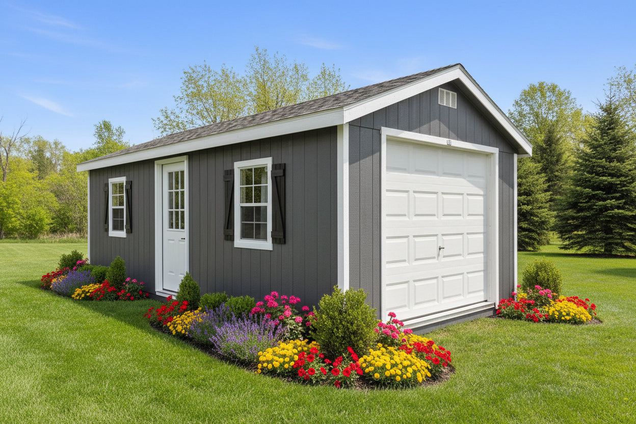 ~ 12X24 Farm Garage Storage Package With Wood Panel Siding ** Roofline - 5/12 Ranch Gable** ~ Building Color - Peppercorn (SW 7674) Super Paint ~ Trim Color - *FASCIA, CORNER, WINDOW & DOOR TRIM* - Super White (SW 6995) ~ Shingles - CertainTeed (Granite Gray) (NorthGate) ~ Drip Edge - White