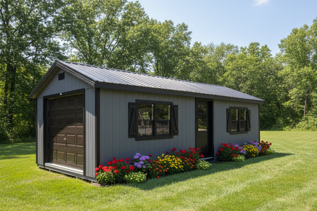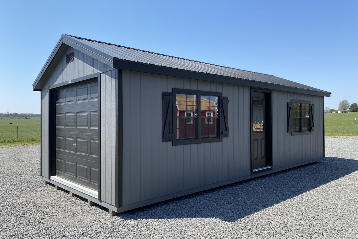 ~ 12X28 Farm Garage Storage Package With Wood Panel Siding ** Roofline - 5/12 Ranch Gable** ~ Building Color - Peppercorn (SW 7674) Super Paint ~ Trim Color - *FASCIA, CORNER, WINDOW & DOOR TRIM* - Tricorn Black (SW6258) Super Paint ~ Steel Roof - Black LC
