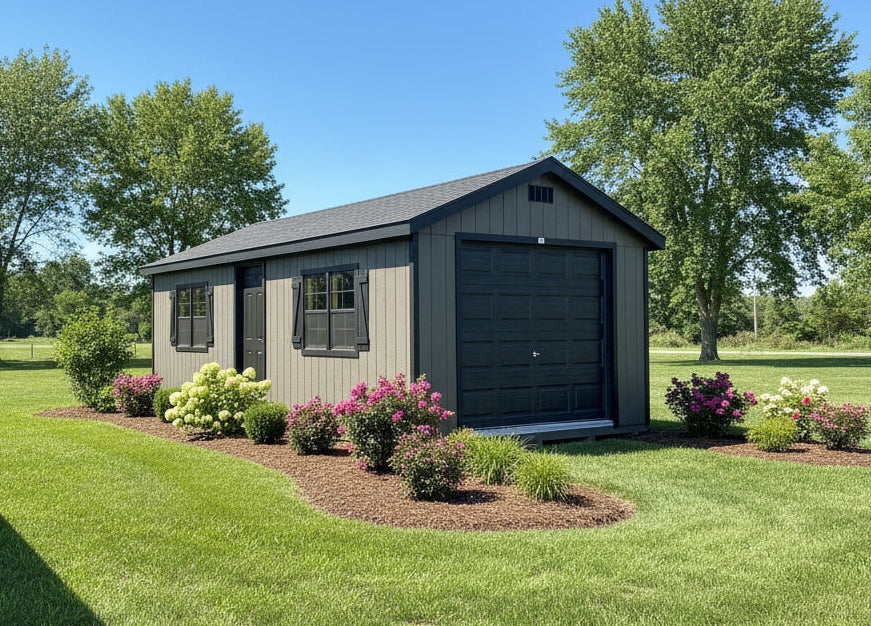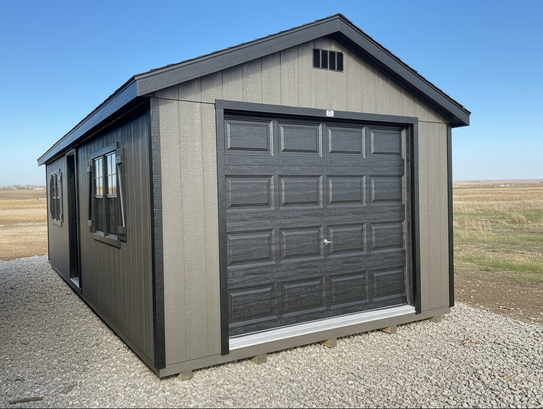 ~ 12X28 Farm Garage Storage Package With Wood Panel Siding ** Roofline - 5/12 Ranch Gable** ~ Building Color - Urbane Bronze (SW 7048) ~ Trim Color - *FASCIA, CORNER, WINDOW & DOOR TRIM* - Tricorn Black (SW6258) Super Paint ~ Shingles - CertainTeed (Black) (NorthGate) ~ Drip Edge - Black