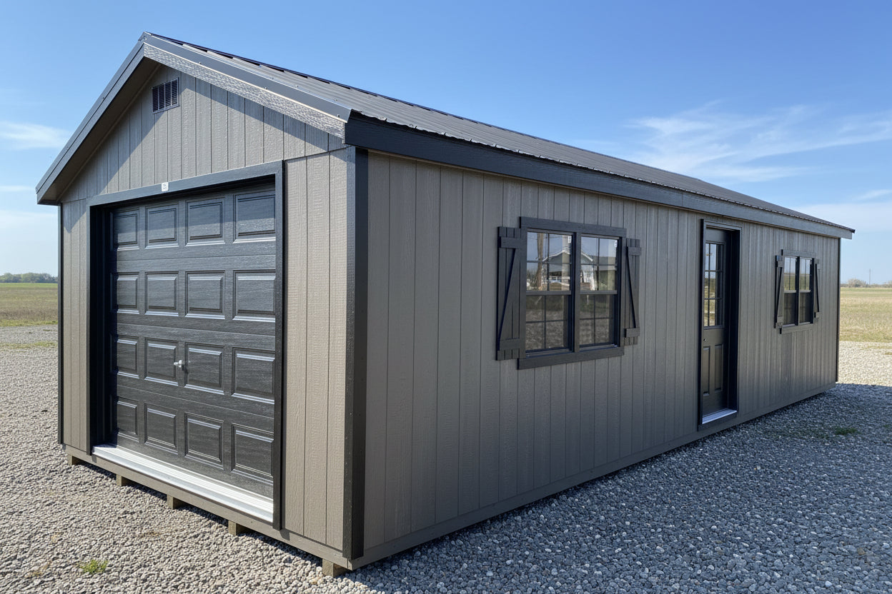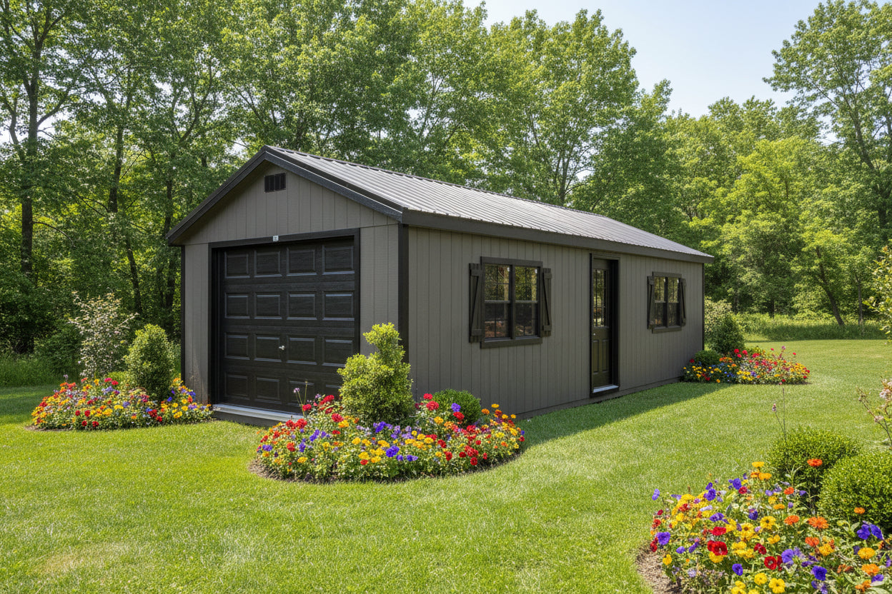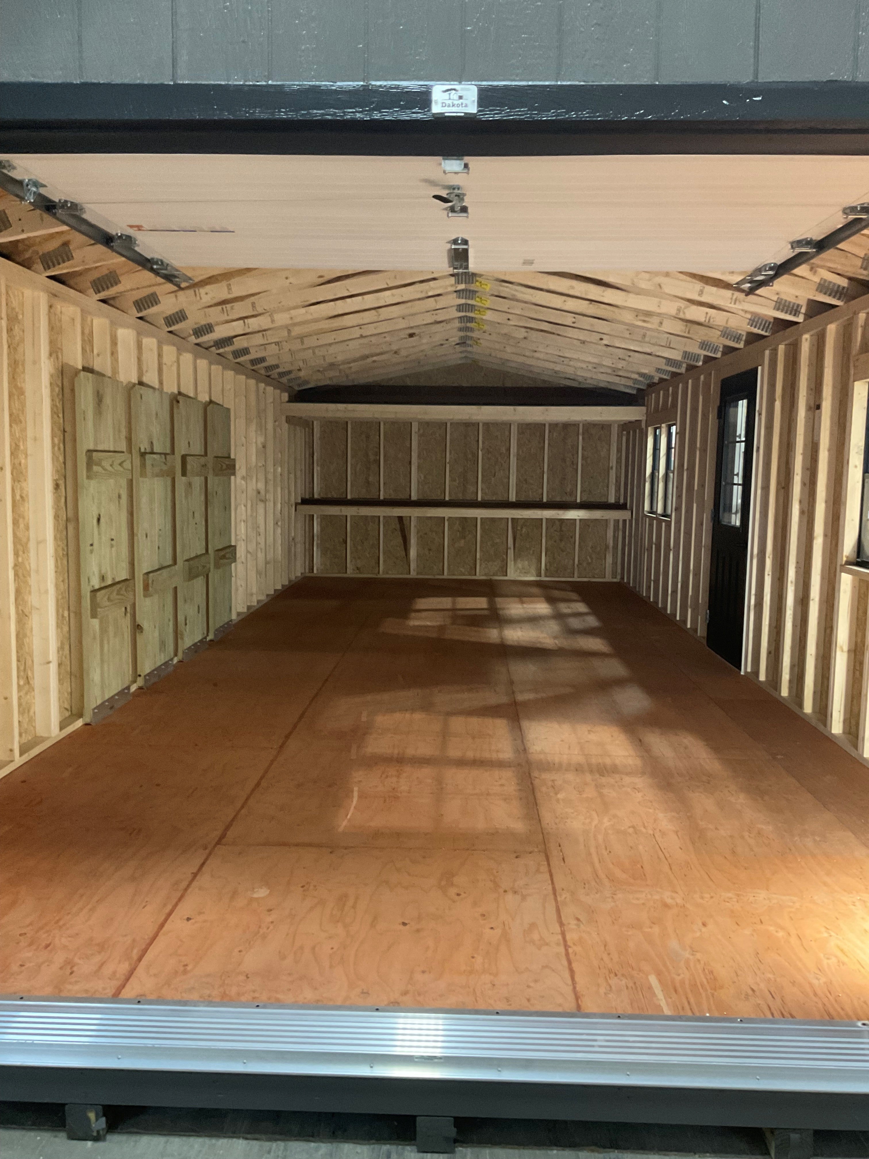 ~ 14X32 Farm Garage Storage Package With Wood Panel Siding ** Roofline - 5/12 Ranch Gable** ~ ***Actual Width of building at the floor is 13' 6'' outside to outside*** ~ Building Color - Urbane Bronze (SW 7048) ~ Trim Color - *FASCIA, CORNER, WINDOW & DOOR TRIM* - Tricorn Black (SW6258) Super Paint ~ Steel Roof - Black LC